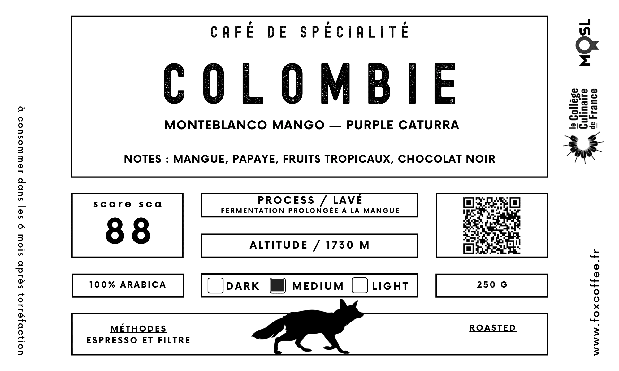 Le lot “Purple Caturra Mango” est le fruit d’une fermentation prolongée et co-fermentée avec de la mangue fraîche. Pendant plus de 180 heures, les cerises de café sont mélangées à des levures naturelles (Saccharomyces cerevisiae) et à un sirop de fruits tropicaux. Ce processus amplifie les sucres naturels du café et révèle un profil gustatif aussi surprenant qu’harmonieux : notes de mangue, papaye, chocolat noir et fruits tropicaux, sur une texture ample et soyeuse. Un café à la fois gourmand et lumineux, pensé comme une œuvre artisanale où la science et la nature dansent ensemble.