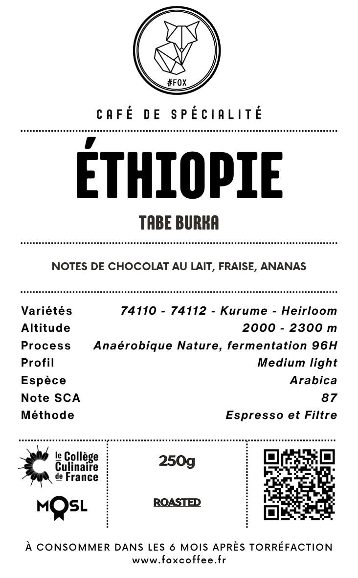 Cap sur le sud de l’Éthiopie, dans la région mythique de Guji, au cœur du woreda d’Uraga. C’est dans le kebele de Tabe Burka, perché entre 2 000 et 2 300 mètres d’altitude, que naît ce café d’exception. Ici, 148 petits producteurs cultivent leurs parcelles en agroforesterie, au sein d’un environnement forestier dense où caféiers et cultures vivrières cohabitent en harmonie. Les cerises sont récoltées à la main, puis confiées à Oboleyan Coffee, une entreprise familiale engagée depuis trois générations. Chaque lot est traité avec une précision remarquable : après un tri rigoureux, les cerises entières sont fermentées en anaérobie pendant 96 heures dans des sacs GrainPro, avant d’être lentement séchées sur lits africains pendant près de trois semaines. Ce travail méticuleux donne naissance à un café profondément expressif, à la fois moderne et fidèle à son terroir.